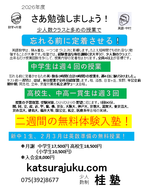 年も押し迫り皆様何かとお忙しいことと思います。桂塾では例年通り学期末の懇談会を行います。今学期の反省をもとに来学期に向けた目標、指針をお話し合いしたいと思います。2者でも3者でも結構です。ご希望の時間をお聞きして30分程度で授業時間外に行いたいと思います。ご希望の方はご連絡お願いいたします。
