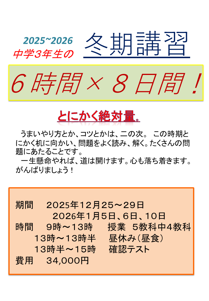 中学3年生は、例年通り12月23日より1日6時間8日間の冬期講習を予定しております。費用は36,000円です。 -